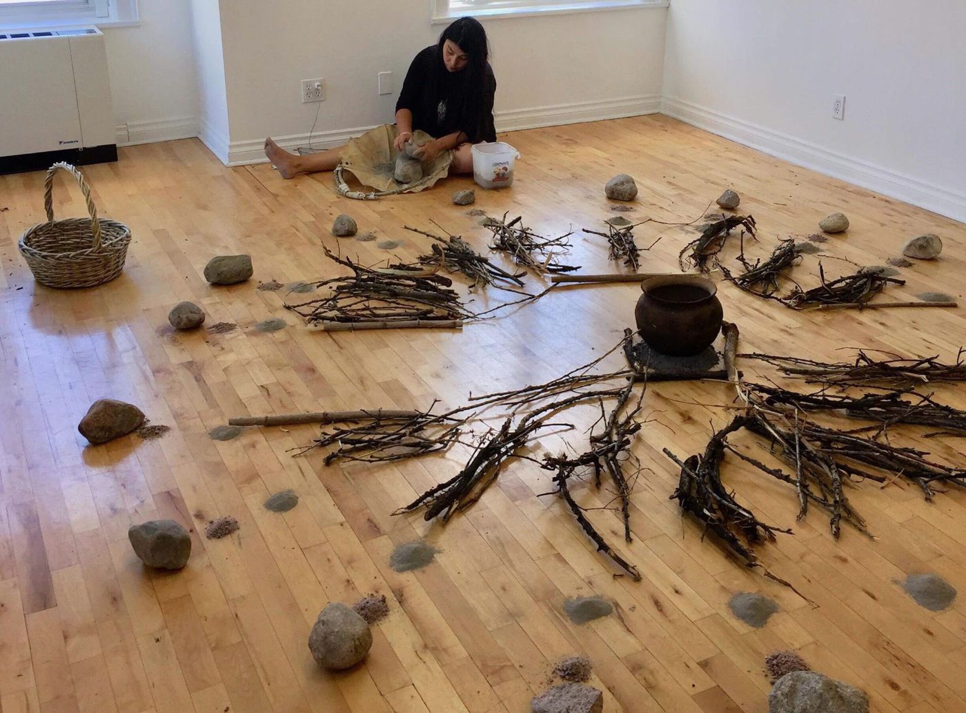 KC Adams creates an installation that highlights the Ojibway teachings towards nibi (water). Once considered a lost art, she embarked upon a journey to learn the techniques of her ancestors on making these vessels. She followed the ancient methods, foraging the clay from ancient Lake Agassiz, shaping the pots like swell of a pregnant belly and firing the pots in a pit fire. Placed within one of the pots is footage of various waterways of her native land and in the background she sings a traditional water song. She reminds us that just like water, women are life-givers and are are considered carriers and protectors of water.